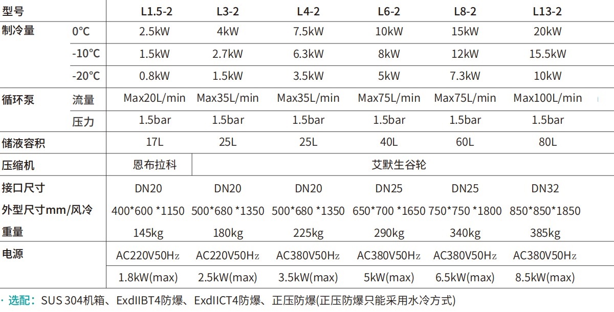 型號(hào)制冷量循環(huán)泵儲(chǔ)液容積壓縮機(jī)接口尺寸外型尺寸mm/風(fēng)冷重量電源